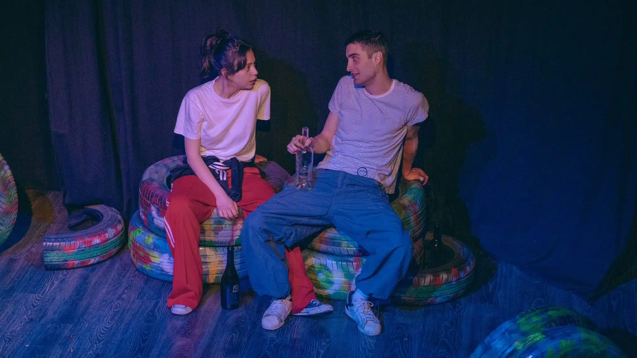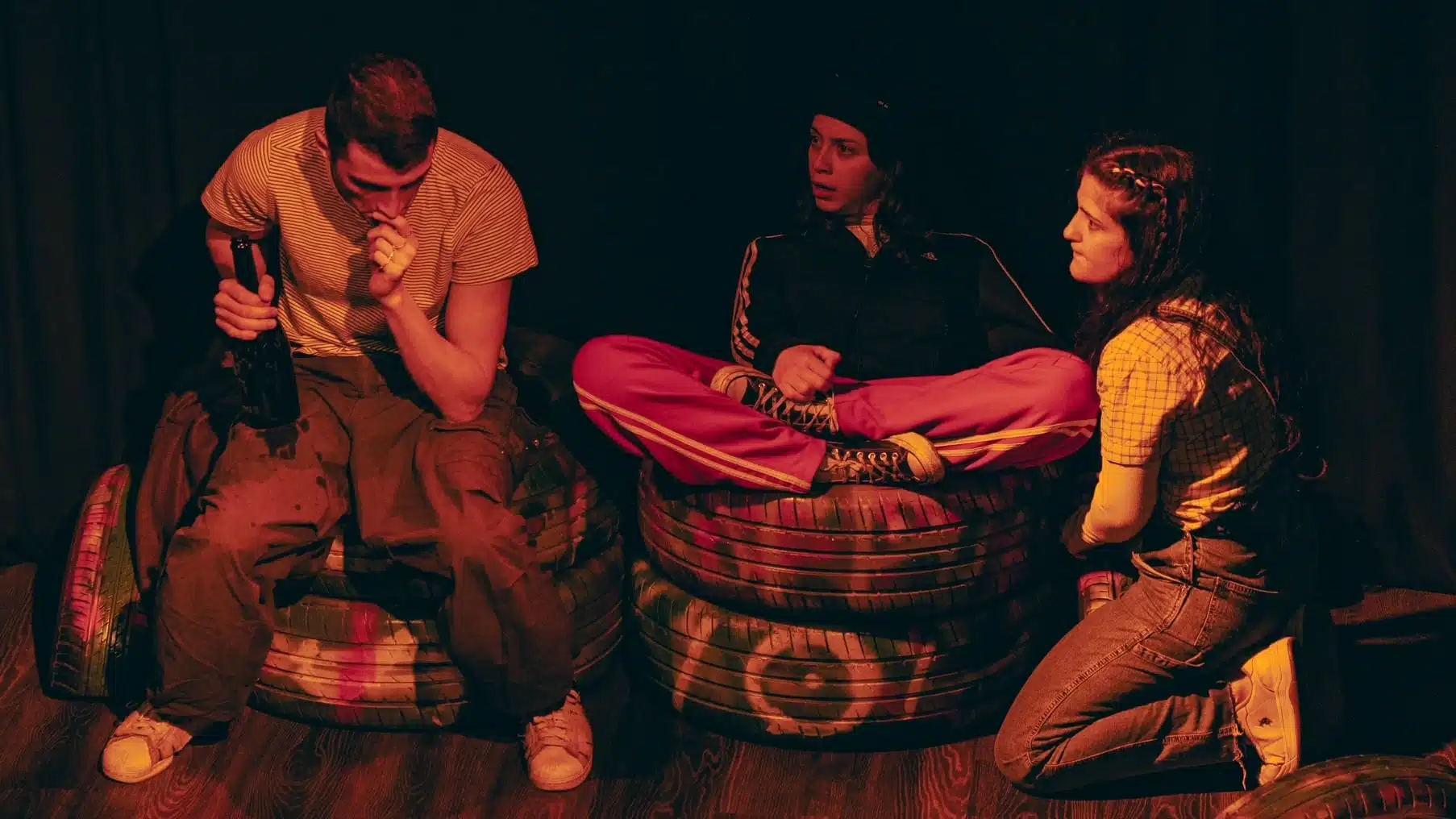 Efe Uzuner’in rejisi ve sahne tasarımı, hikâyedeki sıkışmışlık hissinin mekân sınırlılığıyla algılanmasının önüne geçiyor. Muğlak bir uzamdayız hep; sahilde, tepede, parkta… Kapalı mekanların boğuculuğundan da ara söz ediyor gençler. Zaten gidebilecekleri bir mekânları da yok. Eski araba lastiklerden oturaklar, kuytu izlenimi verse de önü açık alanlar. Yasin Gültepe’nin ışık tasarımı da bu hissi güçlendiriyor, terk edilmişlik ve karanlık hissiyle bütünlüyor.