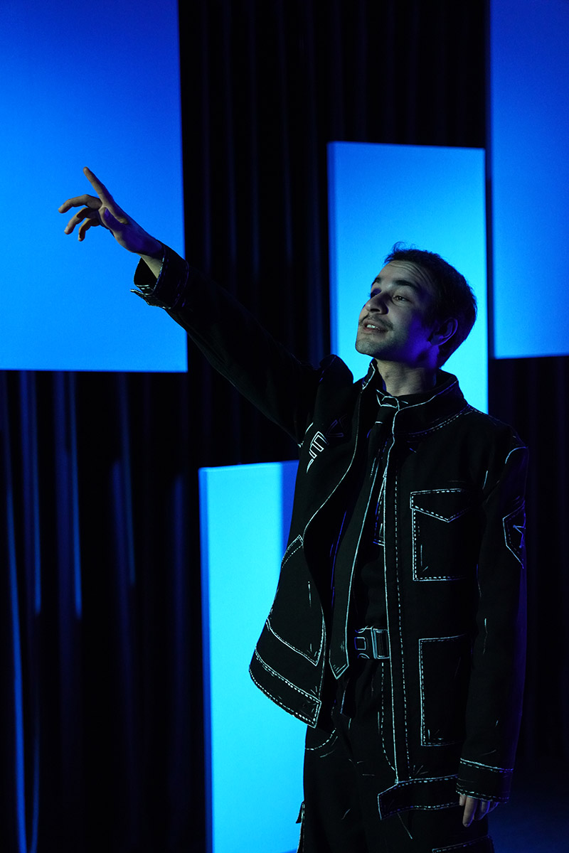 Üniforma giyen iki emekçinin hem gözcü, hem gözetlenen olması da dikkate değer bir açılım. Otorite gibi görünenin aslında bir başka otoritenin sureti olması. Her yeri gören kameraların devre dışı kaldığı anlarda, boğazı sıkan kravatlar gevşiyor, saçı boğan tokalar çıkıyor. Eskiz halindeki üniformalardaki birazcık gevşeme bile altındaki insanı hatırlatıyor. Furkan Anıl Akbey’in tasarladığı ışık, metro beyazlığının net bir temsili. Bu floresan aydınlık, karakterlerin kendinden büyük gölgeleri ve çocukluk hatıralarının sıcak tonu arasındaki geçişlerle duygusal bir zemin yakalıyor, ışık değişimleriyle karakterlerin zaman akışı görünür kılınıyor. Zeynep Moğultay’ın dekor tasarımı da bu beyaz ve aydınlık metro istasyonu kurgusunu destekler bütünlükte. Dekorun iki parçalı simetrisi, birbirlerinin alanlarına pek girmeyen iki farklı karakterin daha görünür olmasına olanak sağlıyor. Sahnenin tam ortasında yükselen beyaz üçgen platform, bu simetriyi kıran tek eleman. İki ayrı dünyanın kısa süreliğine üst üste bindiği bir ada. İçten mavi bir ışıkla aydınlatılan platform zeminden yükseltildiği için bir vitrin etkisi de yaratıyor, Ali ve Nazlı oraya çıktıklarında birbirlerine temas edebiliyor ve daha görünür oluyorlar. Sahnenin ön kenarında boydan boya uzanan sarı çizgi ise tasarımın belki en cesur müdahalesi. Peronun sarı çizgisini seyirci koltuklarının tam önüne taşıyınca, salonun fiziği oyunun içine çekiliyor; biz de çizginin berisinden geçip giden silüetlere, Ali’nin parmağıyla yön gösterdiği isimsiz kalabalığa dönüşüyoruz.