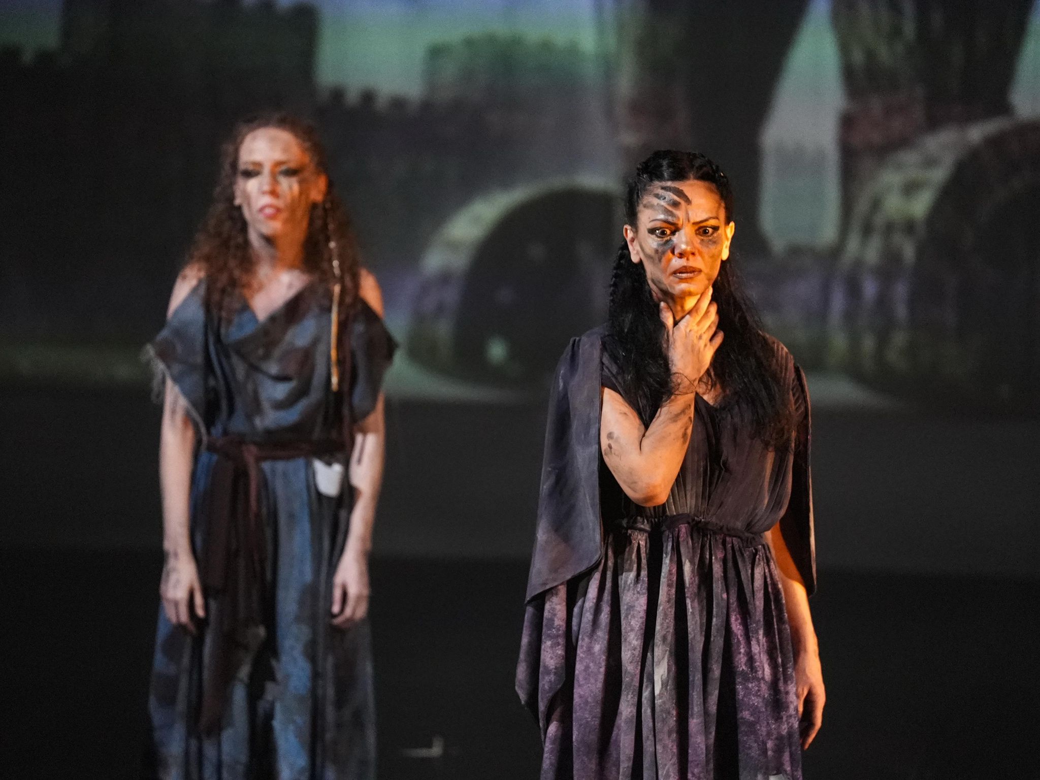 Oyunun görsel dünyası bu düşünsel yapıyı destekliyor. Ataman Girişken’in görsel tasarımı, Nilsu Baldan’ın dekor ve kostüm yaklaşımı, Tuçe Yasak’ın ışık tasarımı; birlikte düşünüldüğünde tutarlı bir sahne evreni kurulmuş. Bu evrende Troya, tarihsel bir gerçeklik olarak birebir yeniden üretmeye çalışan bir dekor anlayışı yerine, boşluk hissi yaratan, sisle derinleşen, gölgeyle çoğalan bir yıkım coğrafyası olarak kuruluyor. Troya’nın antik bir kent olarak değil, bütün yanmış şehirlerin ortak metaforu olarak kullanılması tercih edilmiş. Kostümlerdeki toprak, kül, kirli beyaz, gri ve koyu tonlar oyunun yas estetiğini güçlendiriyor. Oyuncuların üzerinde görünen hem fiziksel hem de ruhsal yıpranmışlık hissi, onları ortak bir tarihsel yaraya ait bedenler haline getiriyor. Baldan’ın tasarımındaki en önemli başarı, antik göndermeyi korurken görsel klişeye düşmemesi. Kostümler; yaşayan, yıpranmış, solmuş kostümler. Dolayısıyla sahnede tarih değil, adeta tarihin tortusu dolaşıyor. Işık tasarımı ise oyunun en belirleyici anlatı araçlarından biri. Tuçe Yasak, ışığı sahne üstünde duygusal bir anlatı kurmak için kullanırken, dar ışık alanları, çevresini yutan karanlık, sisin içinden yükselen bedenler ve gölgenin neredeyse oyuncu kadar etkin olduğu anlara başvuruyor. Bu oyunun tehdit ve yalnızlık hissini sürekli diri tutuyor.