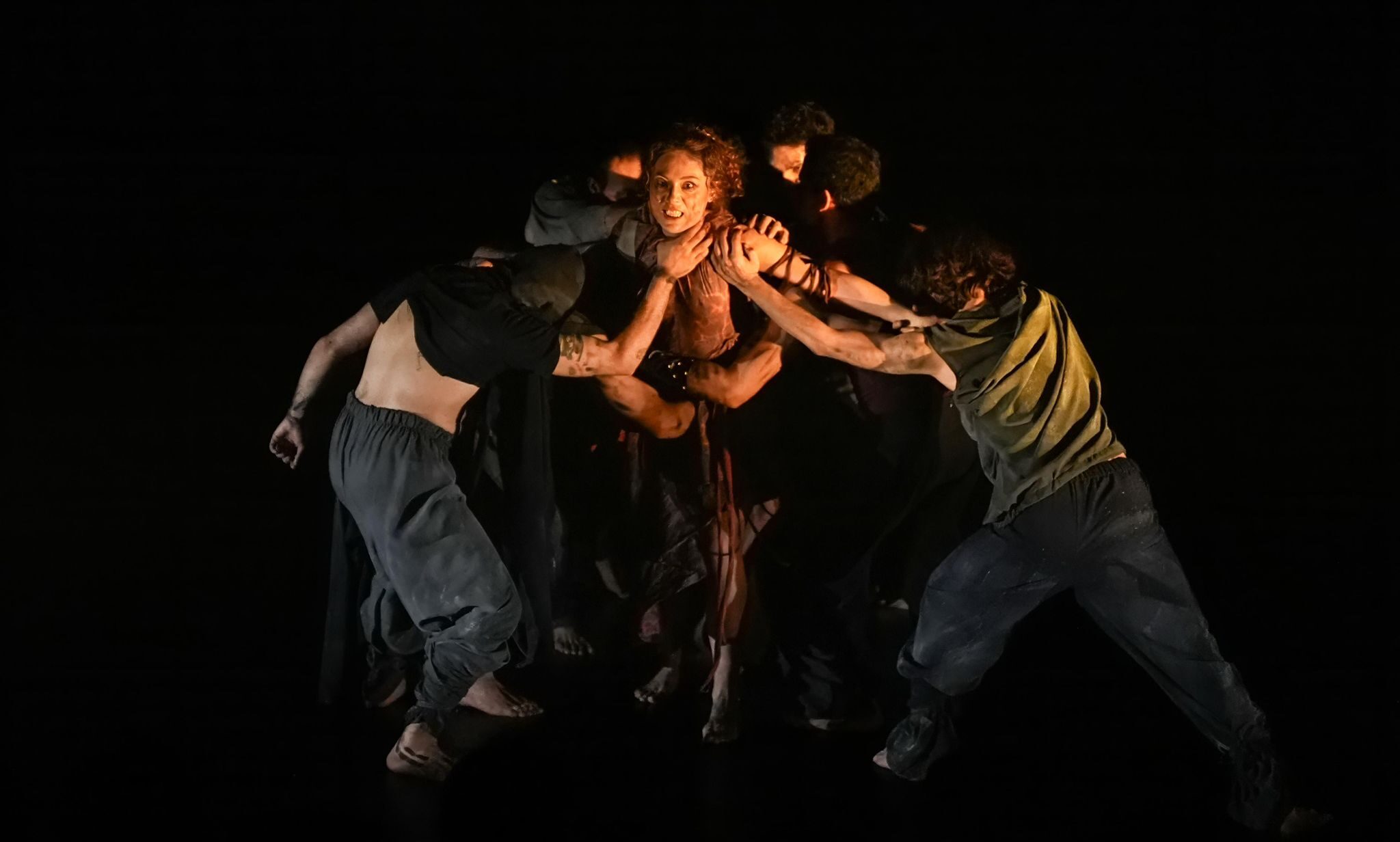 Korhan Başaran’ın rejisi bu düşünsel yapıyı beden üzerinden kurmayı tercih ediyor. Metnin dramatik yapısı kadar, hatta yer yer ondan daha fazla, koreografik yapı belirleyici oluyor. Bu yönüyle Bir Troya Hikâyesi’nin, dramatik tiyatrodan çok, törensel anlatı estetiğine yaklaştığını söyleyebiliriz. Sahnedeki bedenler karakter olmanın ötesine geçerek bazen bir koro, bazen bir yıkıntı, bazen de tarihin yükünü taşıyan toplu bir hafızaya dönüşüyor. Bu fiziksel dilin dikkatle örülmüş bir yapı olduğu anlaşılıyor. Bir figürün etrafında toplanan bedenler, yere kapanan ya da sürünen oyuncular, bir kadının taşınışı, kuşatılışı ya da merkezde tek başına bırakılışı, şiddetin sahne üzerindeki işleyişini görünür kılıyor. Oyuncuların bedenleri iktidar ilişkilerini de ifşa ediyor. Kimin ayakta durduğu, kimin çevrelendiği, kimin taşındığı, kimin yere düştüğü, kimin bakışının doğrudan seyircilere ulaştığı, oyunun politik cümlelerini kuran esas unsurlar arasında yer alıyor.