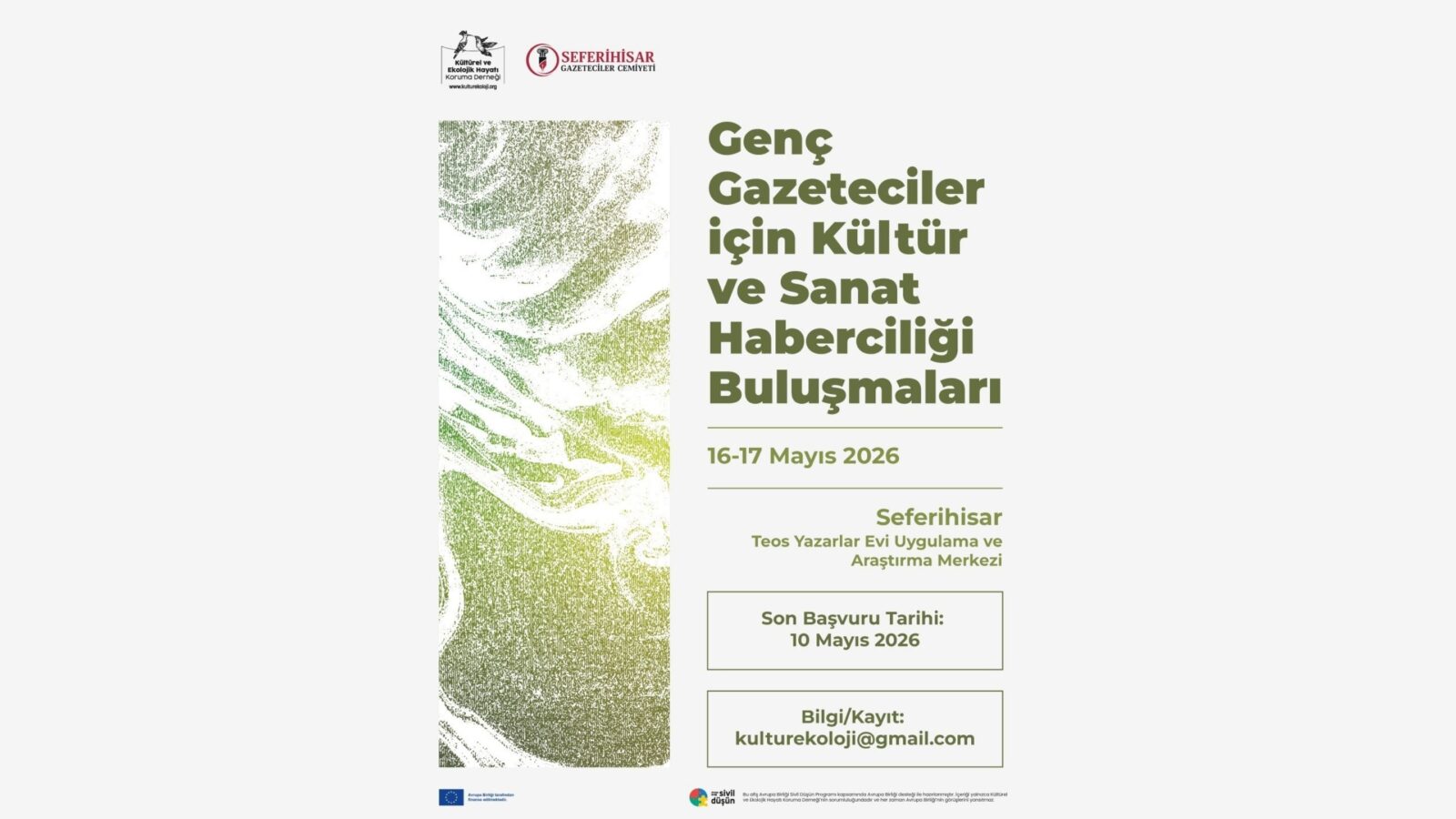 Geçtiğimiz yıllarda Genç Gazeteciler için Tarım Gazeteciliği ve Çevre ve İklim Haberciliği Buluşmaları düzenleyen Kültürel ve Ekolojik Hayatı Koruma Derneği (KültürEkoloji) ve Seferihisar Gazeteciler Cemiyeti’nin (SGC) odağında bu yıl kültür sanat var. İzmir’de kültür ve sanat haberciliğini güçlendirmeyi hedefleyen “Genç Gazeteciler için Kültür ve Sanat Haberciliği Buluşmaları”, 16-17 Mayıs 2026 tarihlerinde Seferihisar’daki Teos Yazarlar Evi Uygulama ve Araştırma Merkezi’nde gerçekleştirilecek.