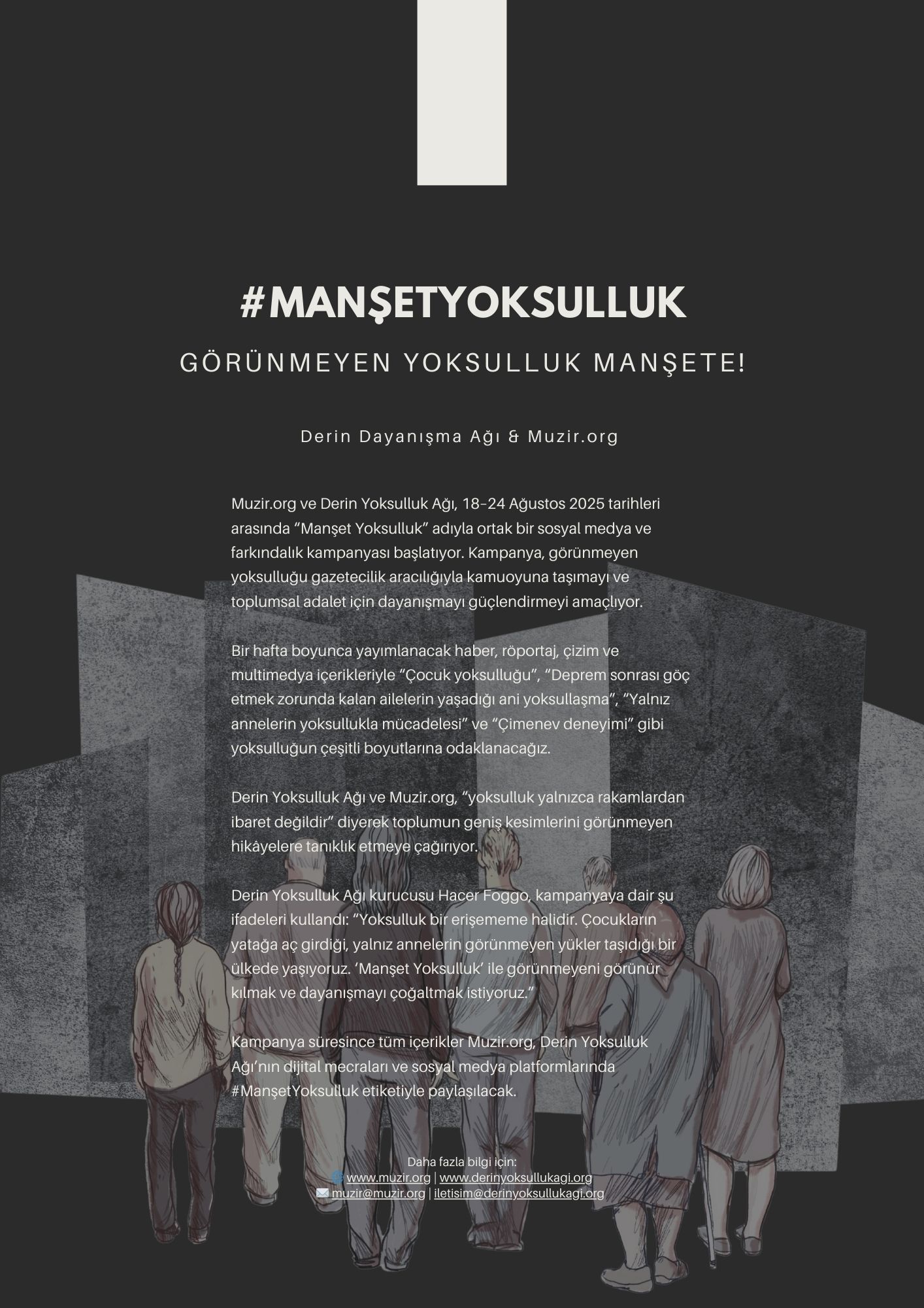 Muzir.org ve Derin Yoksulluk Ağı, 18–24 Ağustos 2025 tarihleri arasında “Manşet Yoksulluk” adıyla ortak bir sosyal medya ve farkındalık kampanyası başlatıyor. Kampanya, görünmeyen yoksulluğu gazetecilik aracılığıyla kamuoyuna taşımayı ve toplumsal adalet için dayanışmayı güçlendirmeyi amaçlıyor.