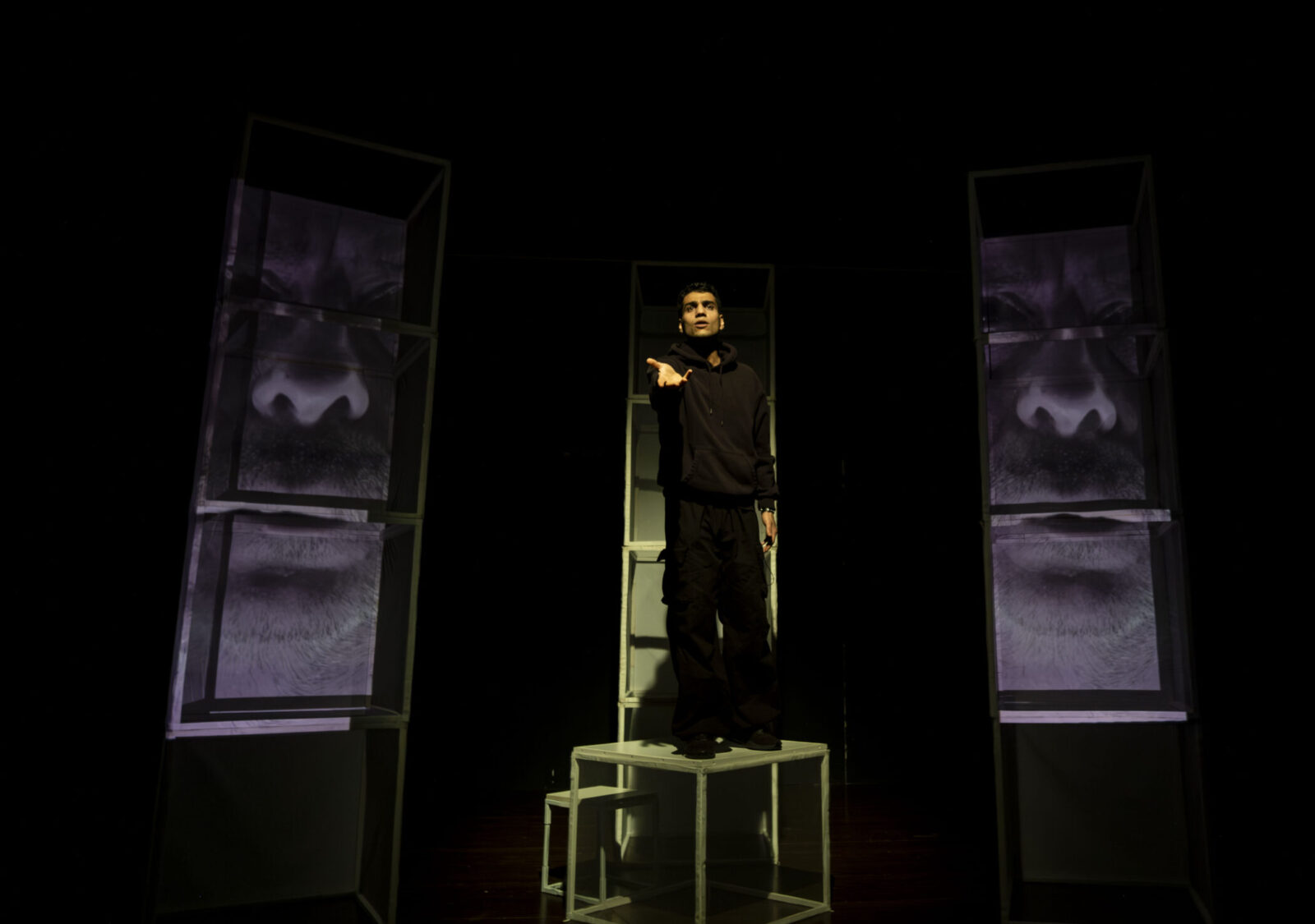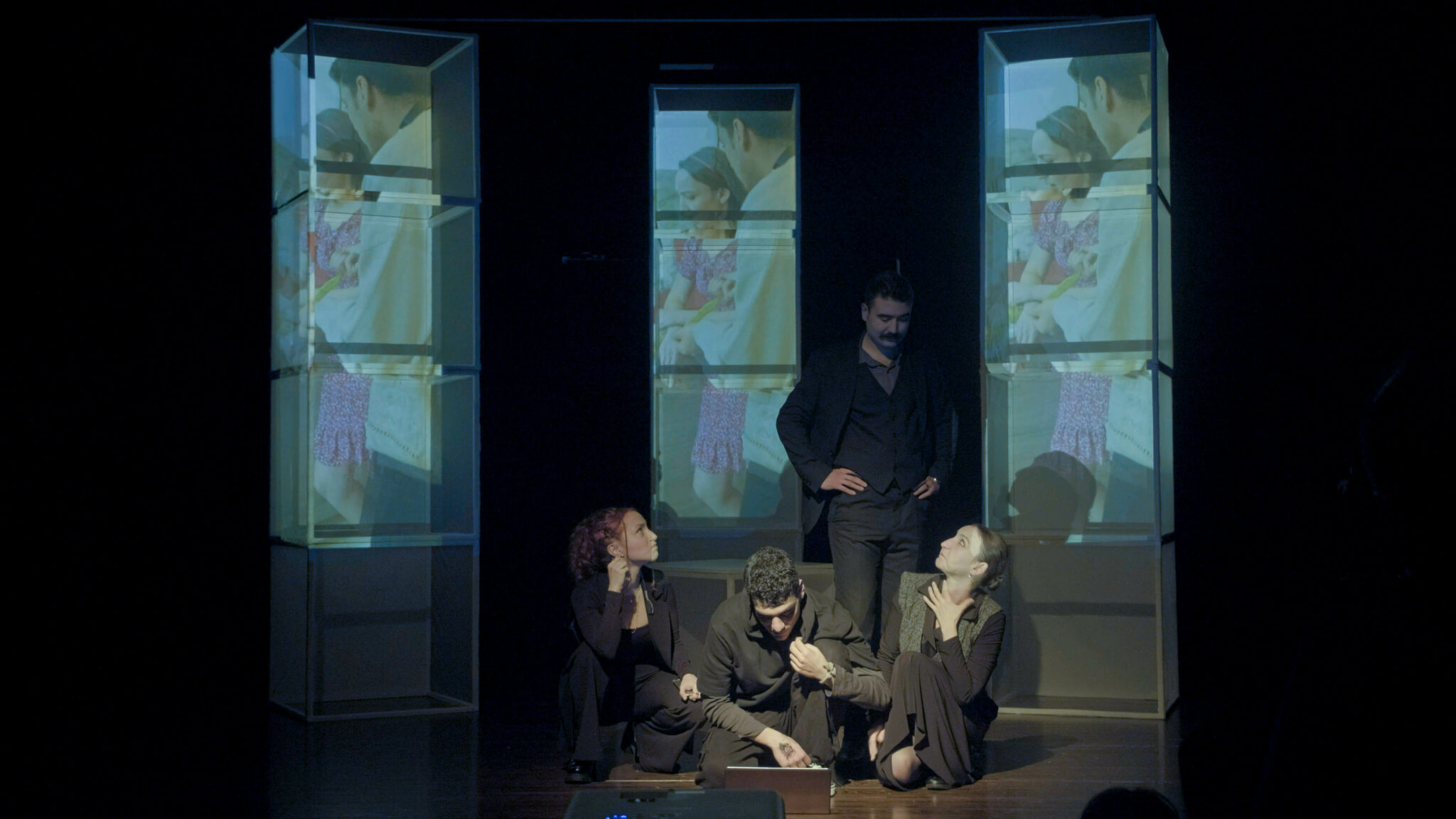 Oyunun üst üste konulduğunda 3 kule oluşturan 12 küpten oluşan dekoru oldukça işlevsel. Kimi zaman binaları ayakta tutan kolonları simgeliyor, kimi zaman içinde hakikat aranan taşınma kutuları. Bu halleriyle hem hikâyenin omurgasını ayakta tutuyorla, hem de biribirine geçmiş anılar toplamını içlerinde taşıyorlar. Kutuları açtıkça hatırlanan hakikatler, kutuların içine girince dile gelen gerçekler, oyunun akışı ve hareketi hep bu kutular etrafında. Oyunun oldukça başarılı olan videolarını da bu kolanlar/kutular üzerinde izliyoruz. Görüntüleri tam bir ekranda değil, üç parça halinde izlemek farklı bir deneyim sunuyor.